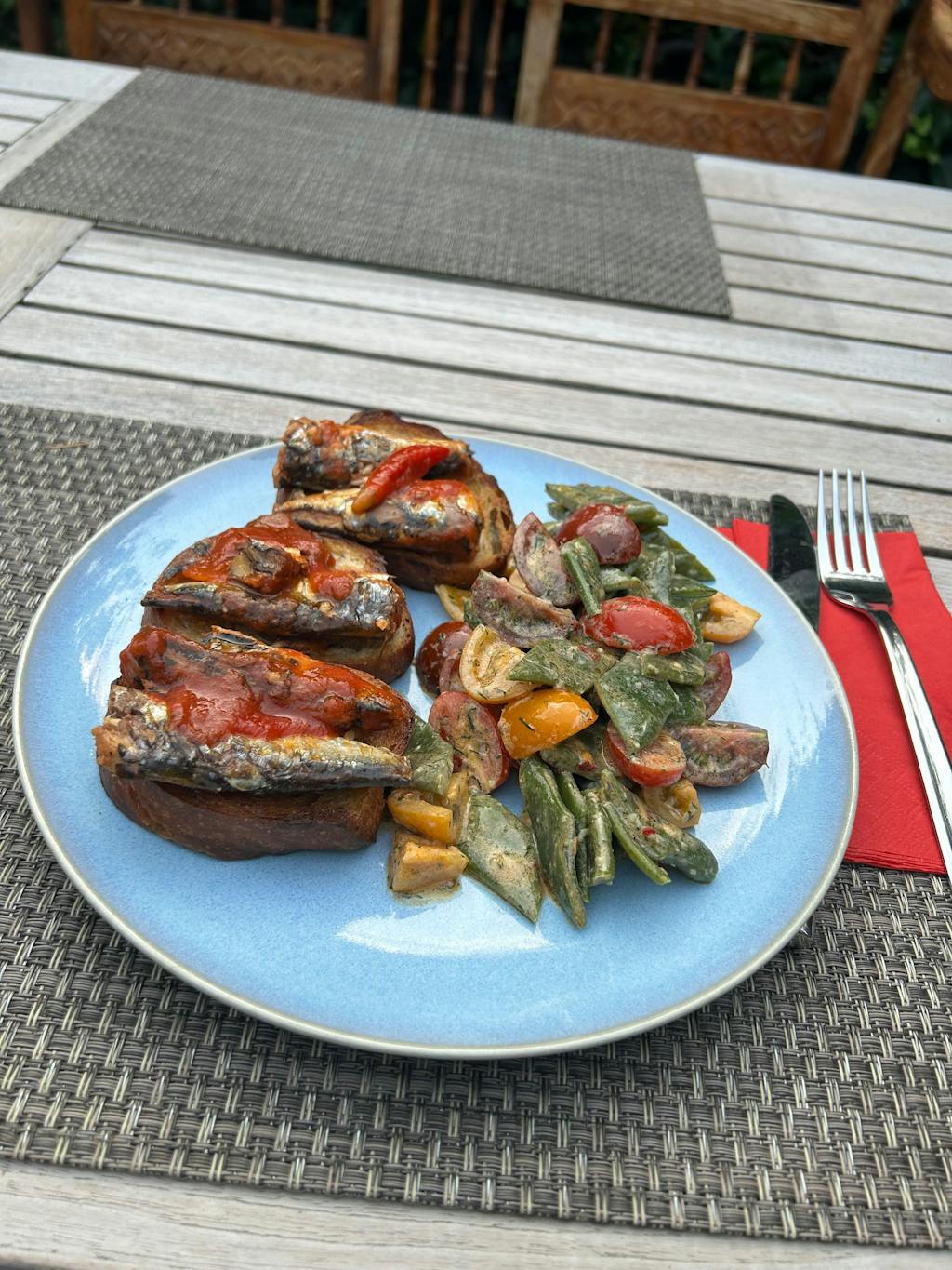 Ingredients: Sardines (72%), tomato sauce (tomato pulp (22%), olive oil (2%), cloves, black pepper, laurel), cucumber, chili (2%), carrot and salt.